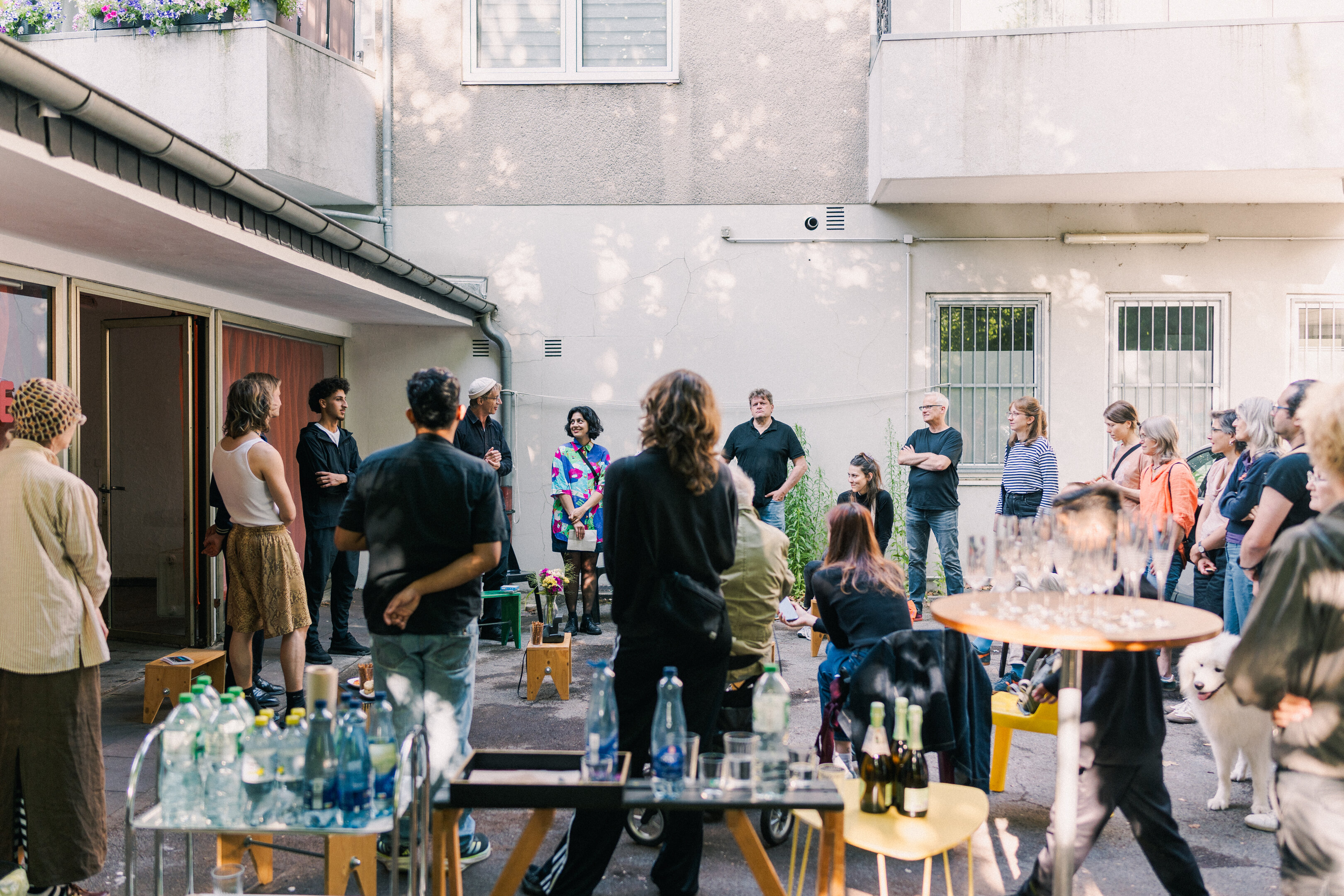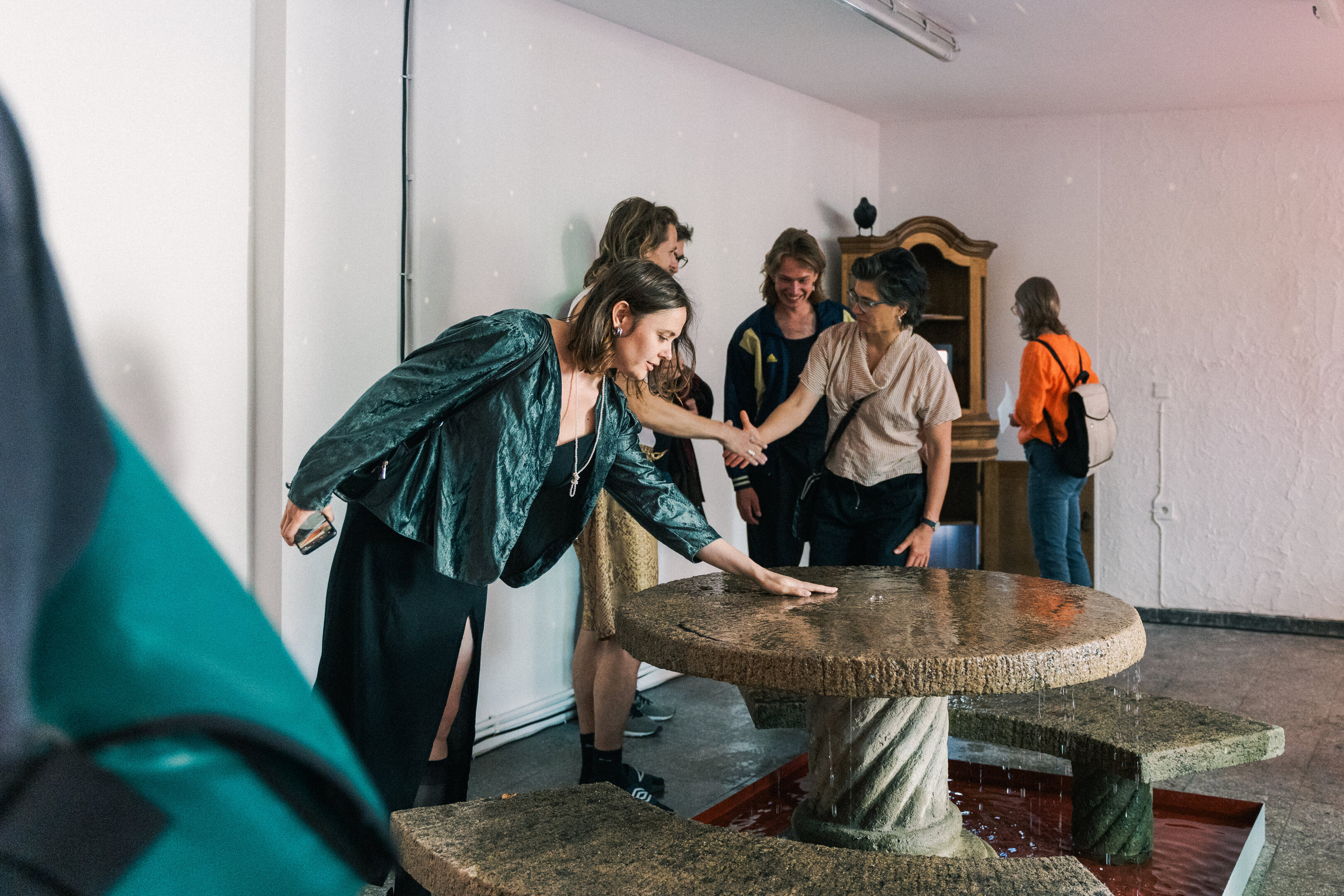 Am 27. Juni eröffnete die erste Ausstellung im Kleinen Laden: ›Wasser und andere Kostbarkeiten‹ widmete sich der Anziehungskraft des Wassers als Lebensquelle und Ort menschlicher Begegnung. Dohlen, Elstern und anderen Rabenvögeln wird in der Mythologie fälschlich eine Vorliebe für Glänzendes nachgesagt. Unsere eigene Faszination für Glitzerndes lässt sich auf einen Urinstinkt zurückführen: die Suche nach Wasser. Gregor Leiprecht verwandelte in Kollaboration mit Konstantin Pütz den Kleinen Laden in eine Eckkneipe, ein Wohnzimmer oder eine Karaokebar – im Zentrum ein Brunnen, aus dem Wasser sprudelt, die Fläche überflutet und das Zusammensein buchstäblich „flüssig“ macht.